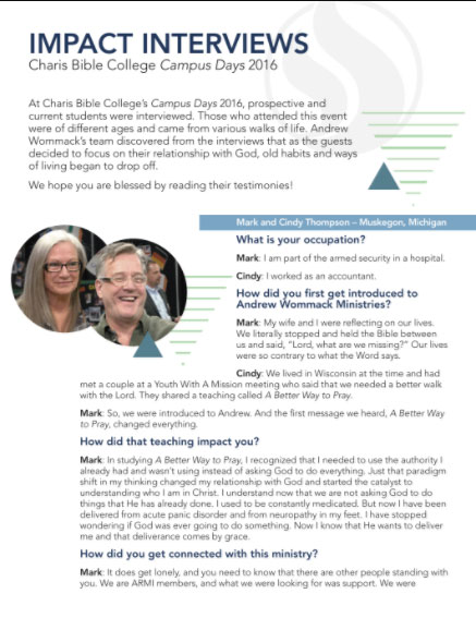 Enjoy these testimonies in the words of those who experienced amazing transformations. Find out how Charis Bible College changed their lives and why they partnered with this ministry. We know you’ll be inspired by these latest Impact Interviews!