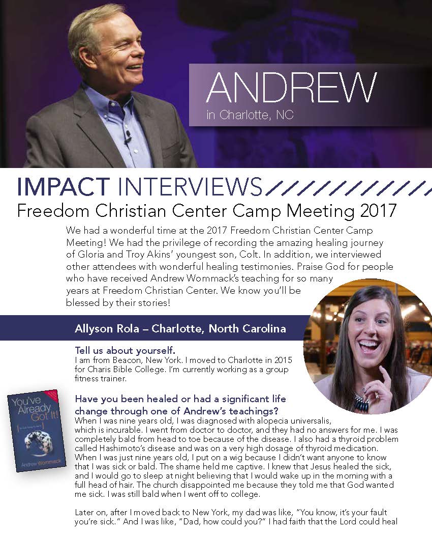 We had a wonderful time at the 2017 Freedom Christian Center Camp Meeting! We had the privilege of recording the amazing healing journey of Gloria and Troy Akins’ youngest son, Colt. In addition, we interviewed other attendees with wonderful healing testimonies. Praise God for people who have received Andrew Wommack’s teaching for so many years at Freedom Christian Center. We know you’ll be blessed by their stories!