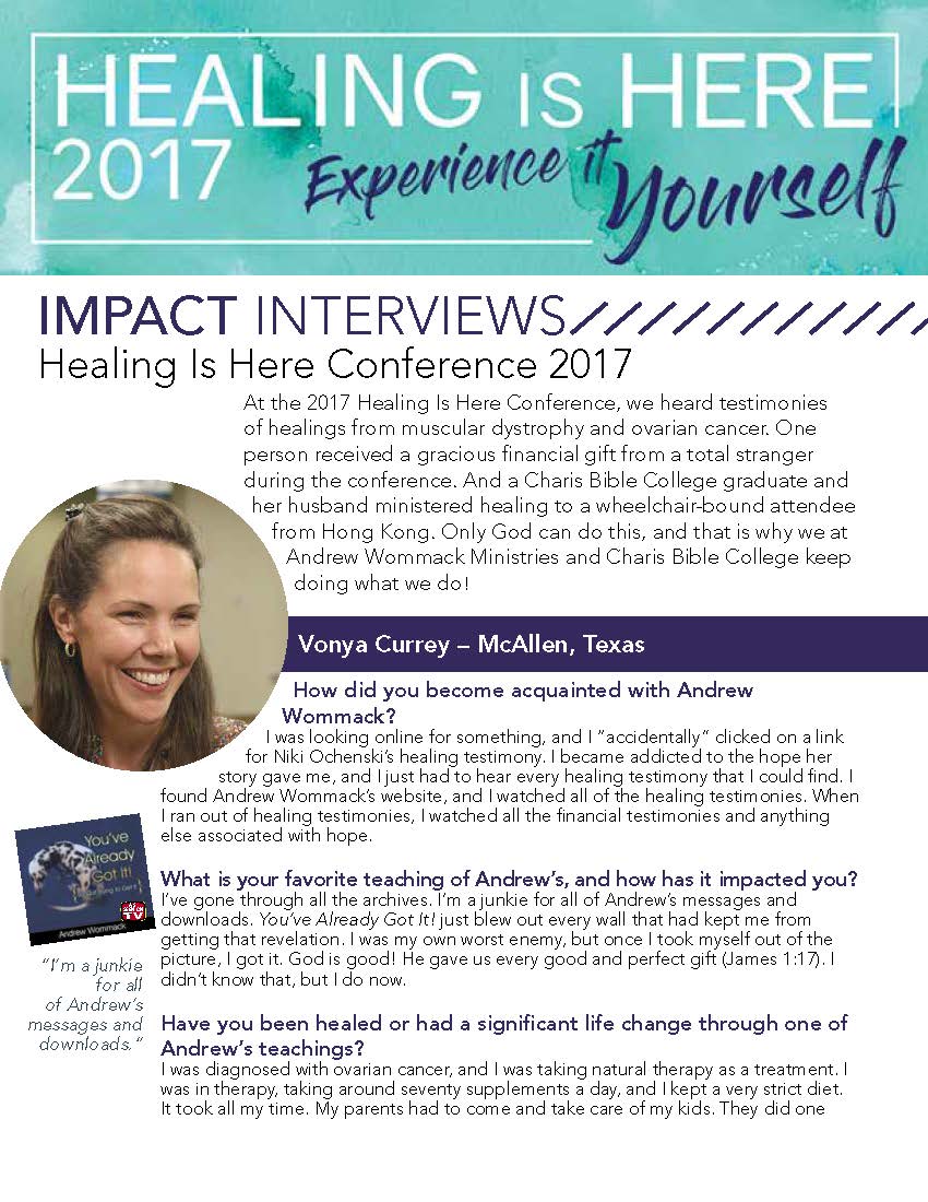 At the 2017 Healing Is Here Conference, we heard testimonies of healings from muscular dystrophy and ovarian cancer. One person received a gracious financial gift from a total stranger during the conference. And a Charis Bible College graduate and her husband inistered healing to a wheelchair-bound attendee from Hong Kong. Only God can do this, and that is why we at Andrew Wommack Ministries and Charis Bible College keep doing what we do!